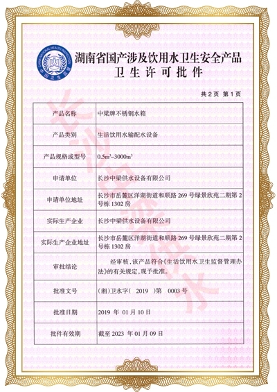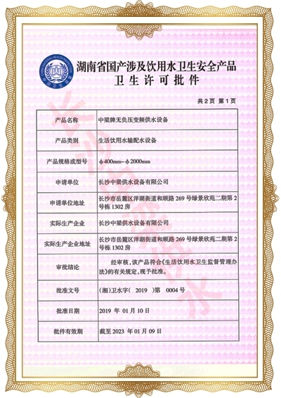 長(zhǎng)沙中梁供水設(shè)備有限公司已先后通過(guò)湖南省衛(wèi)生廳國(guó)產(chǎn)涉及飲用水衛(wèi)生產(chǎn)品衛(wèi)生許可批準(zhǔn);
